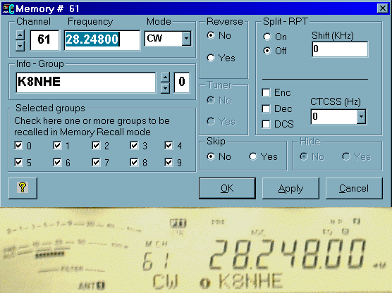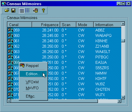 For all Transceivers featured with the necessary CAT functions (*) TRX-Manager allows a comprehensive management of the memory channels. Almost all programmable settings are supported (including the labels on some recent transceivers). But TRX-Manager also allows adding settings that are not supported by your transceiver such as repeater Shift, CTCSS, Labels... Of course the program allows scanning and saving bank of channels on hard disk. |